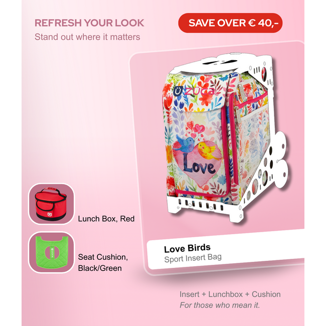 Love is in the air! De ZÜCA Love Birds Bundle is een explosie van kleur en vrolijkheid. De twee verliefde vogeltjes tussen kleurrijke bloemen en hartjes maken van elke dag een feestje – of je nu naar school gaat, naar de ijsbaan of op avontuur.